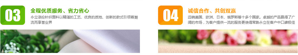 公司成立于1997年,坐落于風(fēng)景秀麗的虞山腳下,位于中國經(jīng)濟(jì)最活躍的版圖--長江三角洲經(jīng)濟(jì)技術(shù)開發(fā)區(qū)的黃金地段上,常熟市永立針紡織有限公司,伴隨著中國針紡織品行業(yè)蓬勃發(fā)展,走過了10多年的創(chuàng)業(yè)歷程,如今已發(fā)展成為一家集工、貿(mào)于一身,在行業(yè)內(nèi)聞名遐邇的專業(yè)生產(chǎn)滌綸針織面料的特色企業(yè)。本公司擁有來自臺灣的先進(jìn)制造設(shè)備,以雙面小提花機為主的34寸(16--45針)雙面緯編機50臺、34寸(20--50針)單面開幅機9臺、36寸 22針德國邁耶OVJE雙面電腦大提花機6臺及其他先進(jìn)設(shè)備。憑借著一流的設(shè)備,以及“人無我有,人有我好,人好我轉(zhuǎn)”的經(jīng)營理念,常熟永立一直致力于滌綸面料的創(chuàng)新...